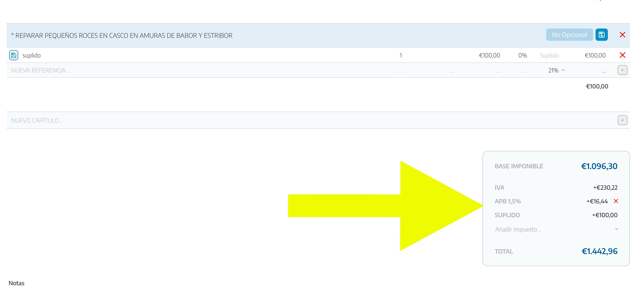 La aplicación de los impuestos a la totalidad de la base imponible vendrá desglosada directamente en el cuadro final de valoración.