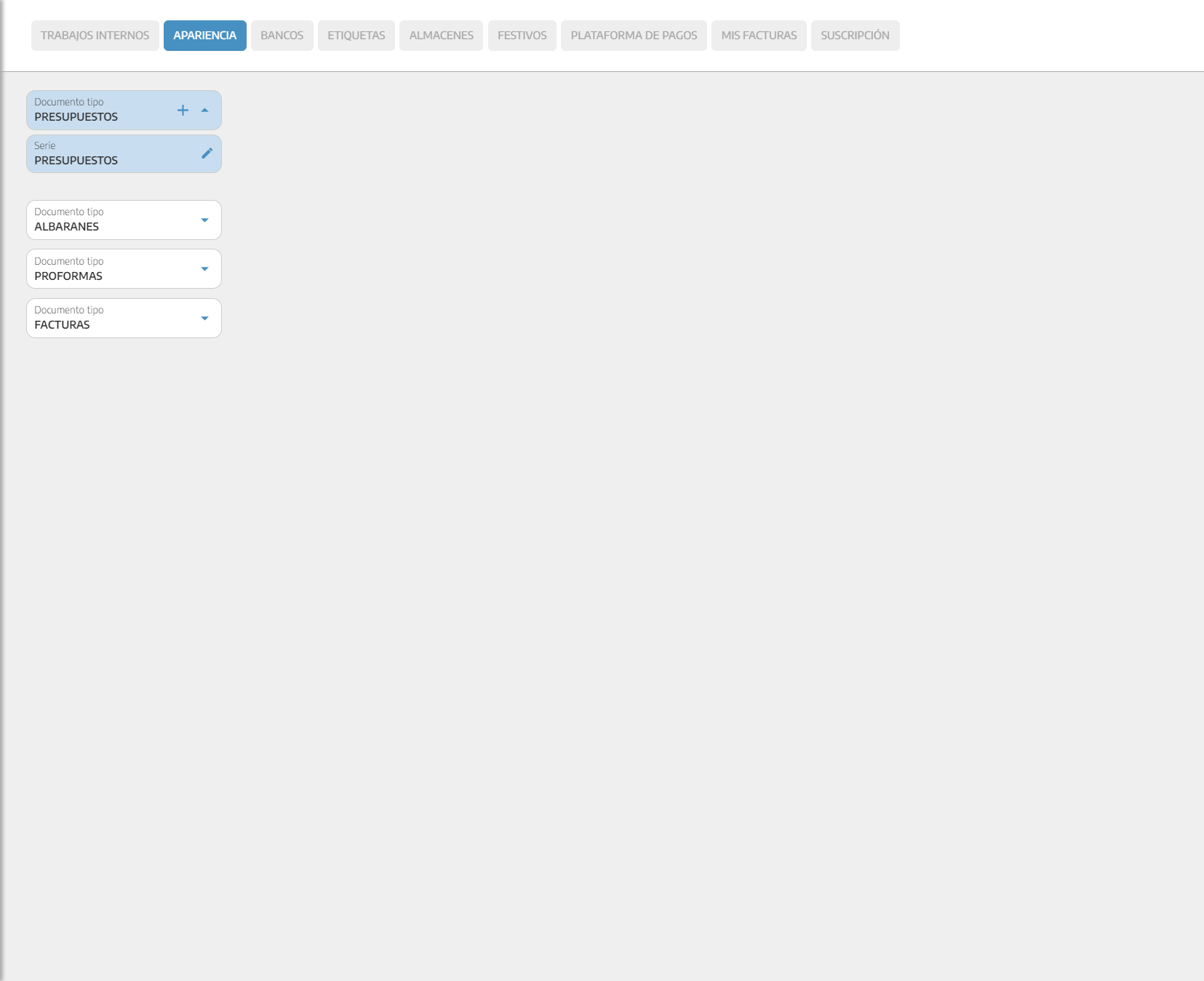 En la pestaña APARIENCIA accederas a los documentos y su configuración. Puedes configurar cada documento de manera distinta, así como generar cuantas series de documentos sean necesarias.