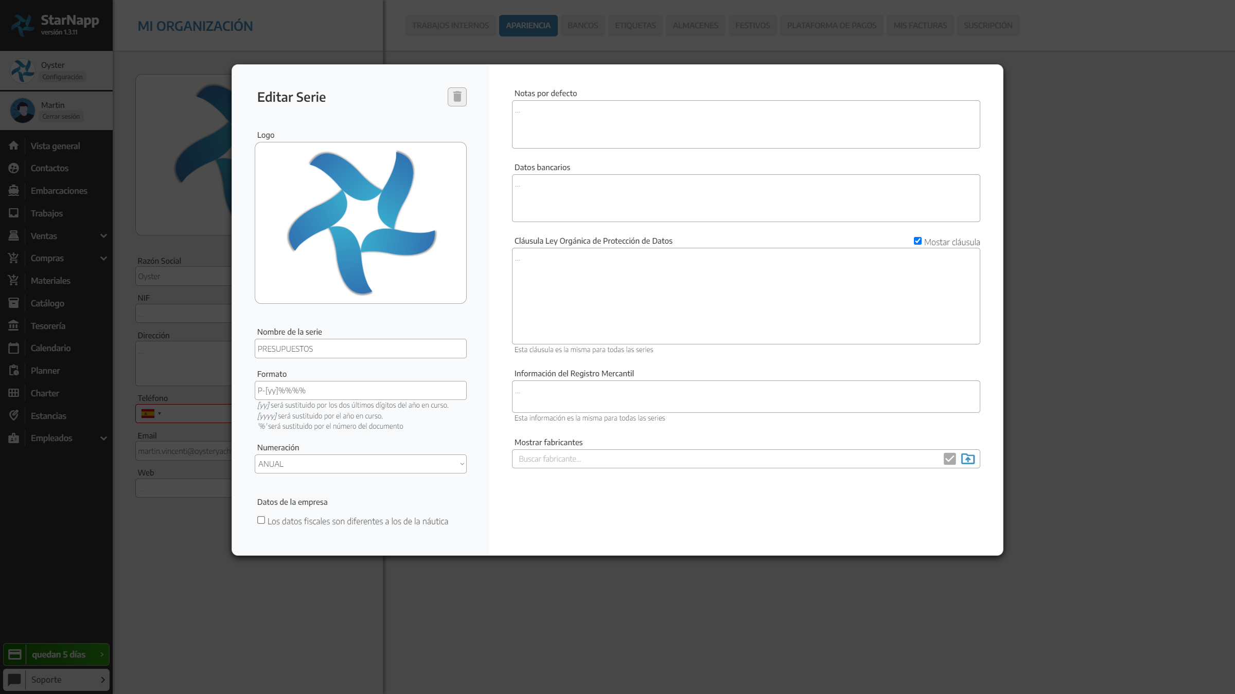 En este apartado podrás elegir los fabricantes para los que tu organización trabaja, servicio oficial, marcas de embarcaciones que representa, etc. Sólo tienes que buscar el fabricante y darle al check para que incorpore el logo de dicho fabricante en la parte inferior del documento. Puedes incluir varios fabricantes y en cada documento o cada serie pueden ser distintos. De tal manera que se puedan incluso generar documentos dependiendo del fabricante, por ejemplo Serie Suzuki y aparecería el logo de Suzuki y Serie Yamaha donde aparezca sólo el logo de Yamaha, o poner los dos, esto es totalmente configurable por la organización. Si existiera algún logo que no estuviera cargado previamente puedes cargar directamente dicho logo para que aparezca en la parte inferior.