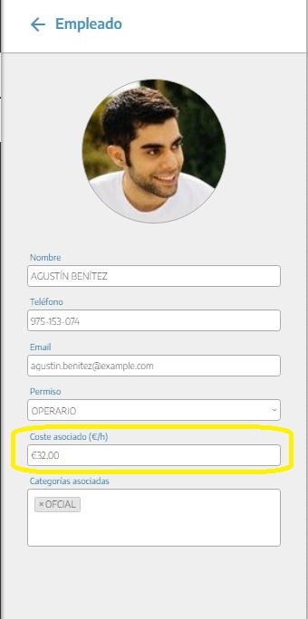 Selecciona el empleado que quieras incluir o modificar su coste. Indica su precio de coste y su categoría de trabajos.