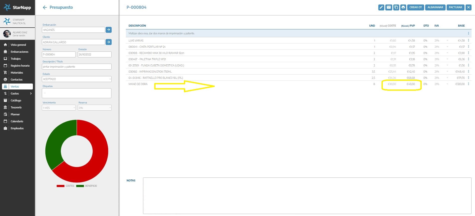 El resultado una vez cambiado es que StarNapp te calculará en cualquier presupuesto, Orden de Trabajo, Albarán o Factura los costes de Mano de Obra imputados efectuando el descuento del coste para la empresa y el precio de venta de la mano de obra, lo que hará que el "donut" sea eficaz en tu cálculo de costes y beneficios esperados.