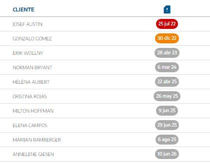 Ve a la pestaña en la parte superior de documentos, y al pulsar filtrará por las caducadas en primer lugar en color ROJO, las que están próximas a caducar en color NARANJA y las fechas de próxima renovación en color GRIS.