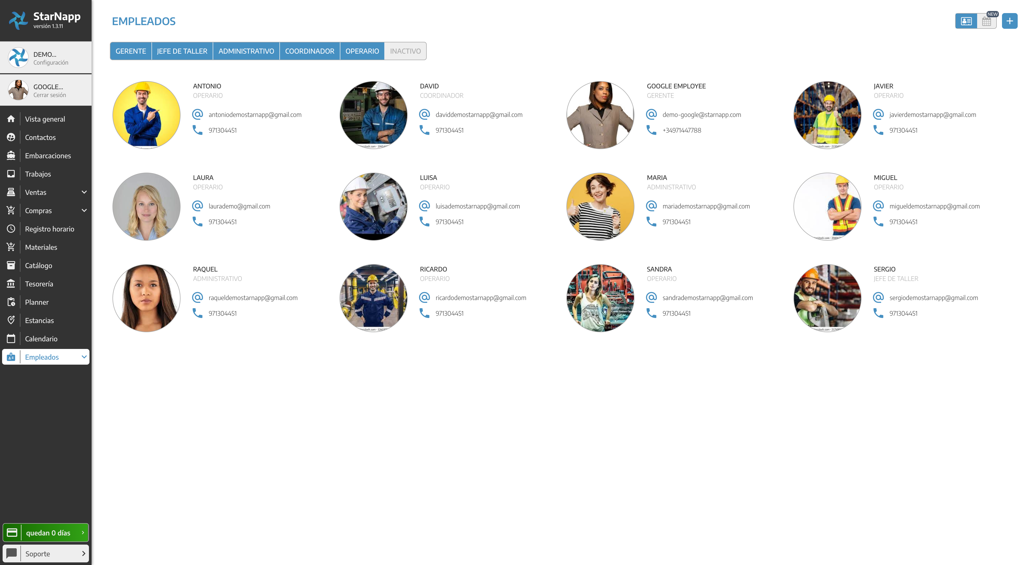 En los perfiles podrás observar la vista de cada uno de los empleados de la náutica y donde accederás a las fichas de dichos empleados.