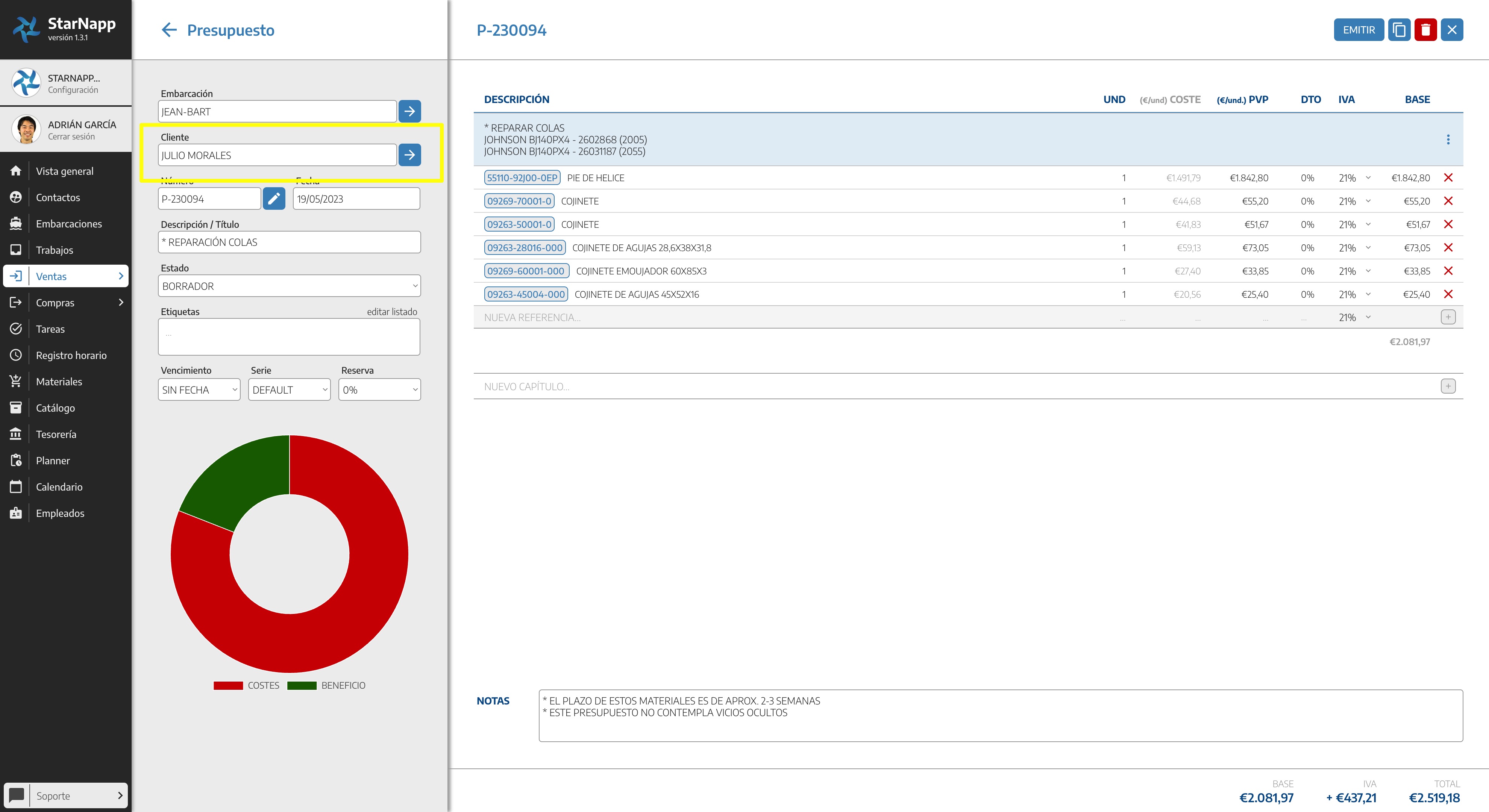 Editamos el documento emitido, en este caso disponemos de un Presupuesto emitido a nombre de JULIO MORALES.