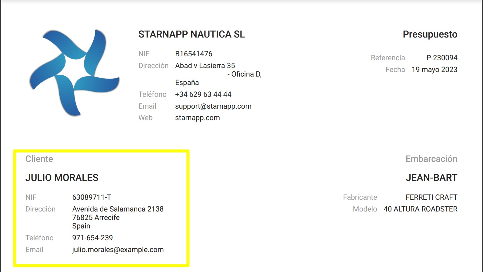 Esta modificación NO AFECTA al propietario de la embarcación dado que no hemos modificado dicho propietario, sino únicamente el documento al que vamos a enviar y efectuar el documento, que puede ser cualquier a delos que pueden enviarse, Presupuesto, Albarán, Factura Proforma y/o Factura, manteniéndose este contacto durante la emisión de los documentos que vienen de una trazabilidad.