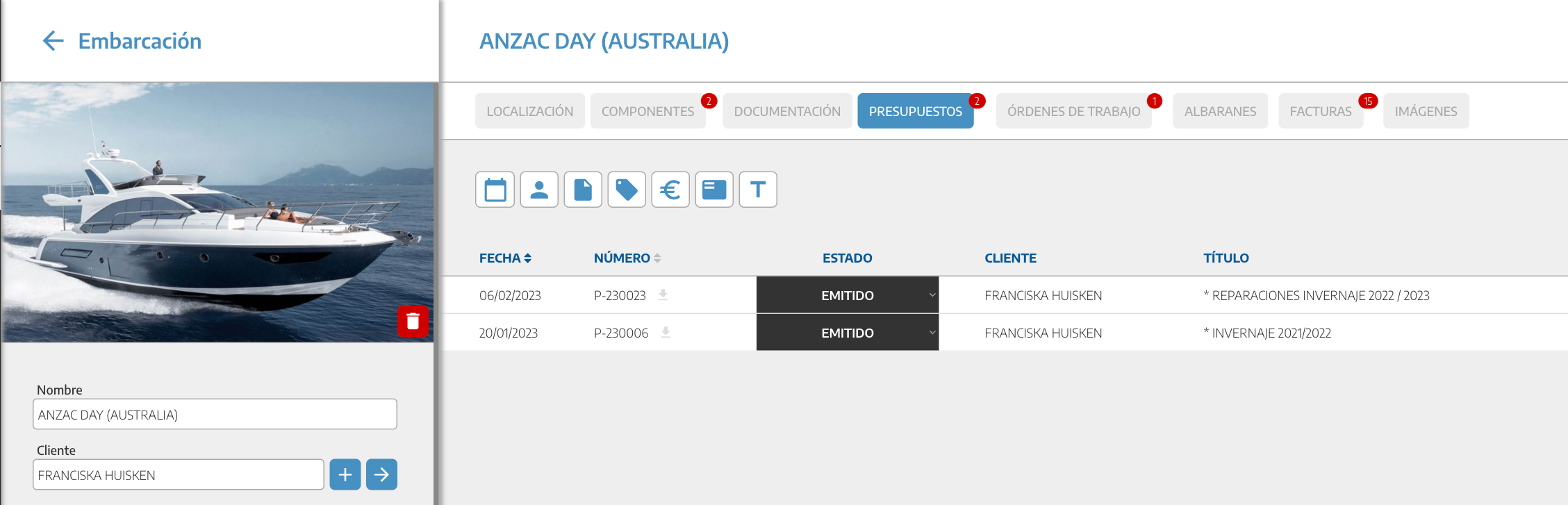 Estas fotografías pueden consultarse tanto en la ficha de la embarcación como en cada una de las ordenes de trabajo que tengan fotografías cargadas, quedando dichas fotografías ordenadas en todo momento en el trabajo efectuado.