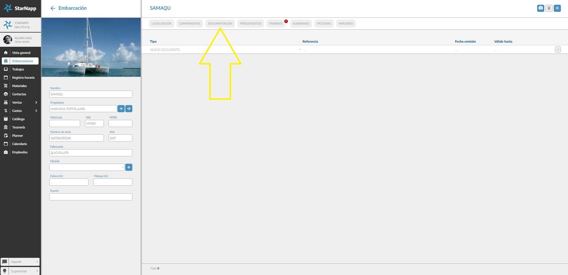 Acceder a la embarcación deseada y en la parte superior podrás ver la pestaña DOCUMENTACIÓN donde debes pulsar para entrar en la pantalla donde se puede ver y cargar la documentación de la embarcación.