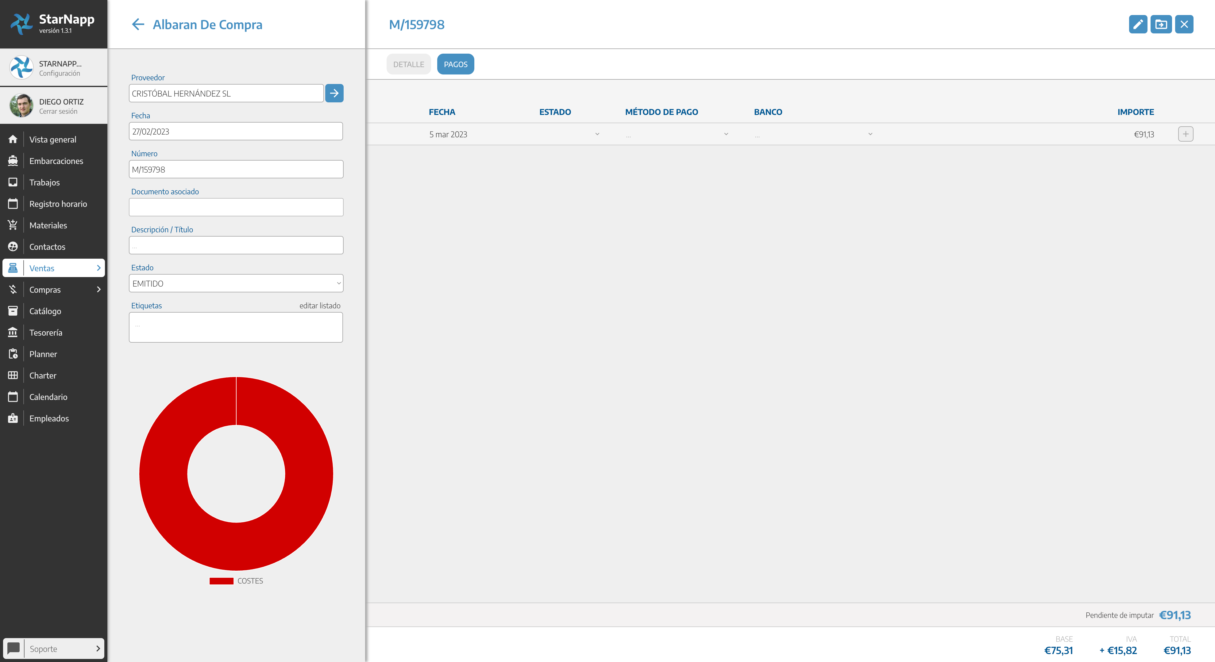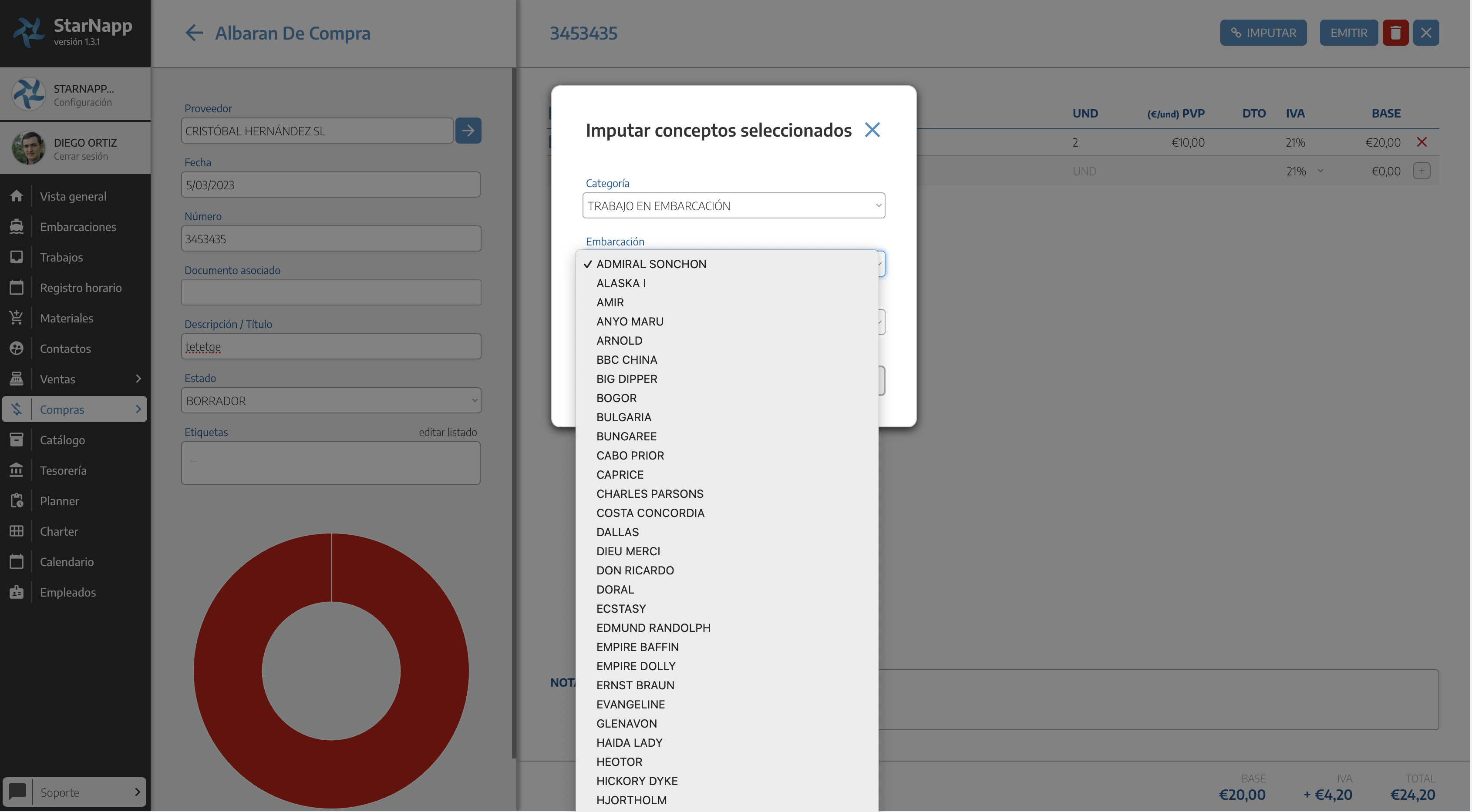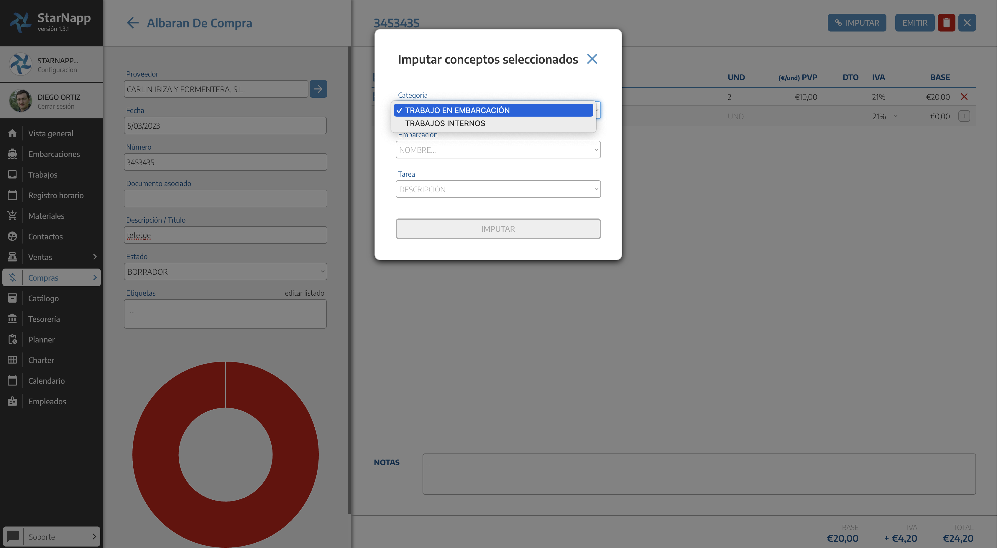 Si queremos asignar este material a una OT o una embarcación en la que se está trabajando, o incluso a trabajos internos debemos hacer click en el cuadro de la izquierda donde nos habilitará la posibilidad de IMPUTAR.