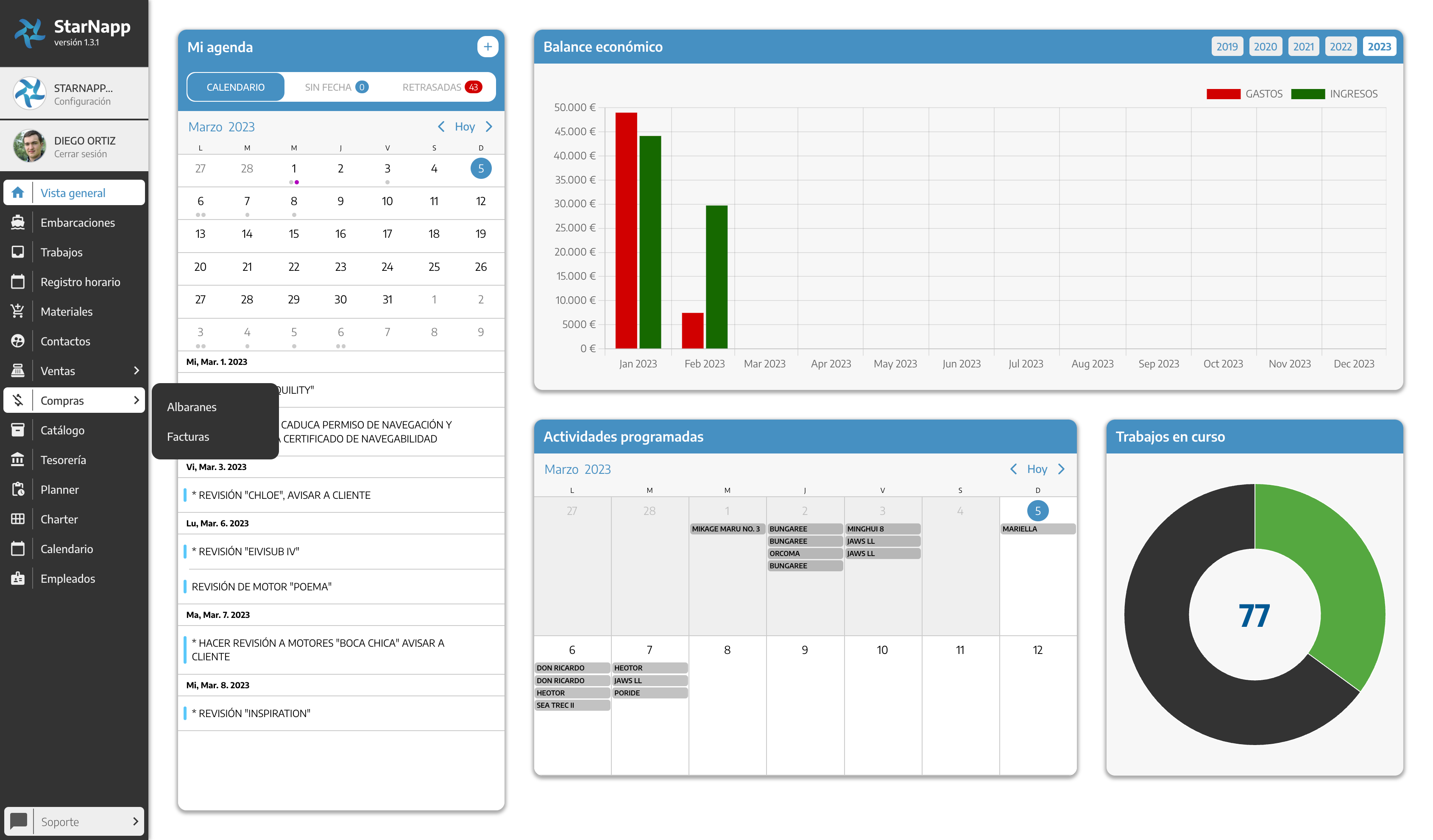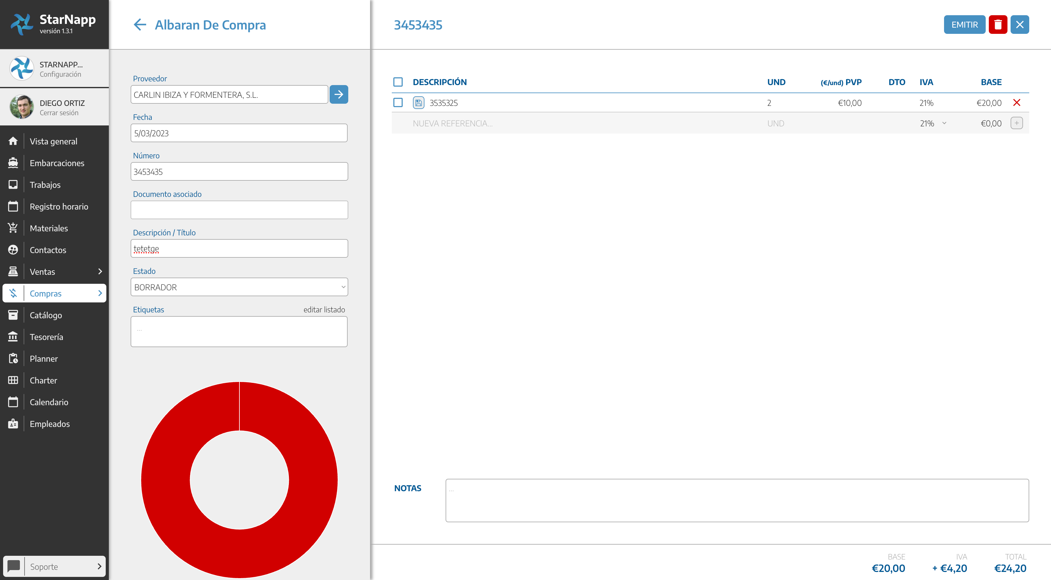 En el menu lateral disponemos del apartado COMPRAS donde podemos cargar aquellos ALBARANES o FACTURAS de compras de materiales o consumibles de la empresa.