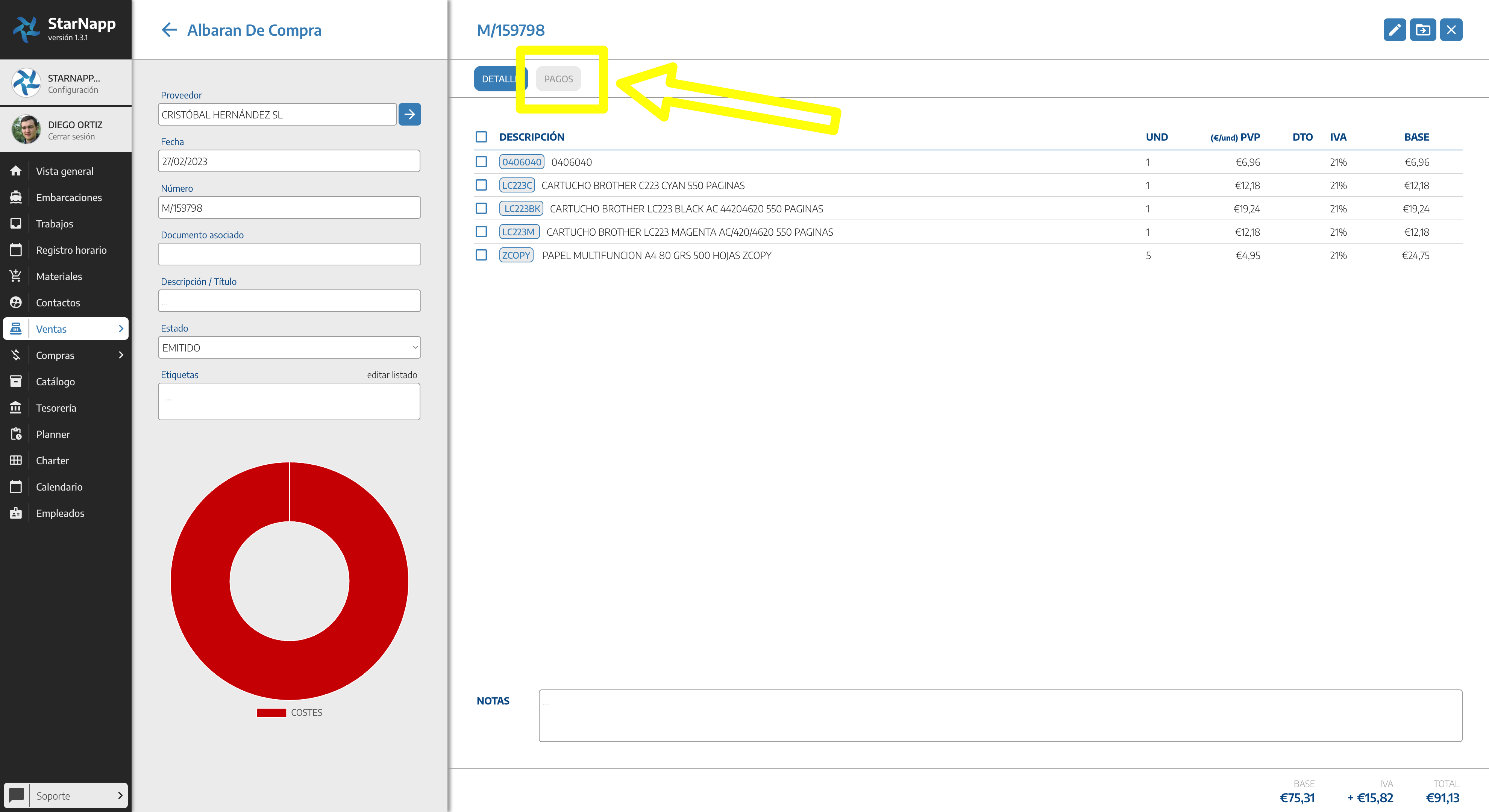 Dentro de los albaranes y facturas en el lado izquierdo tenemos una pestaña destinada a guardar el documento, si se trata por ejemplo de un archivo PDF o una foto de un albarán.