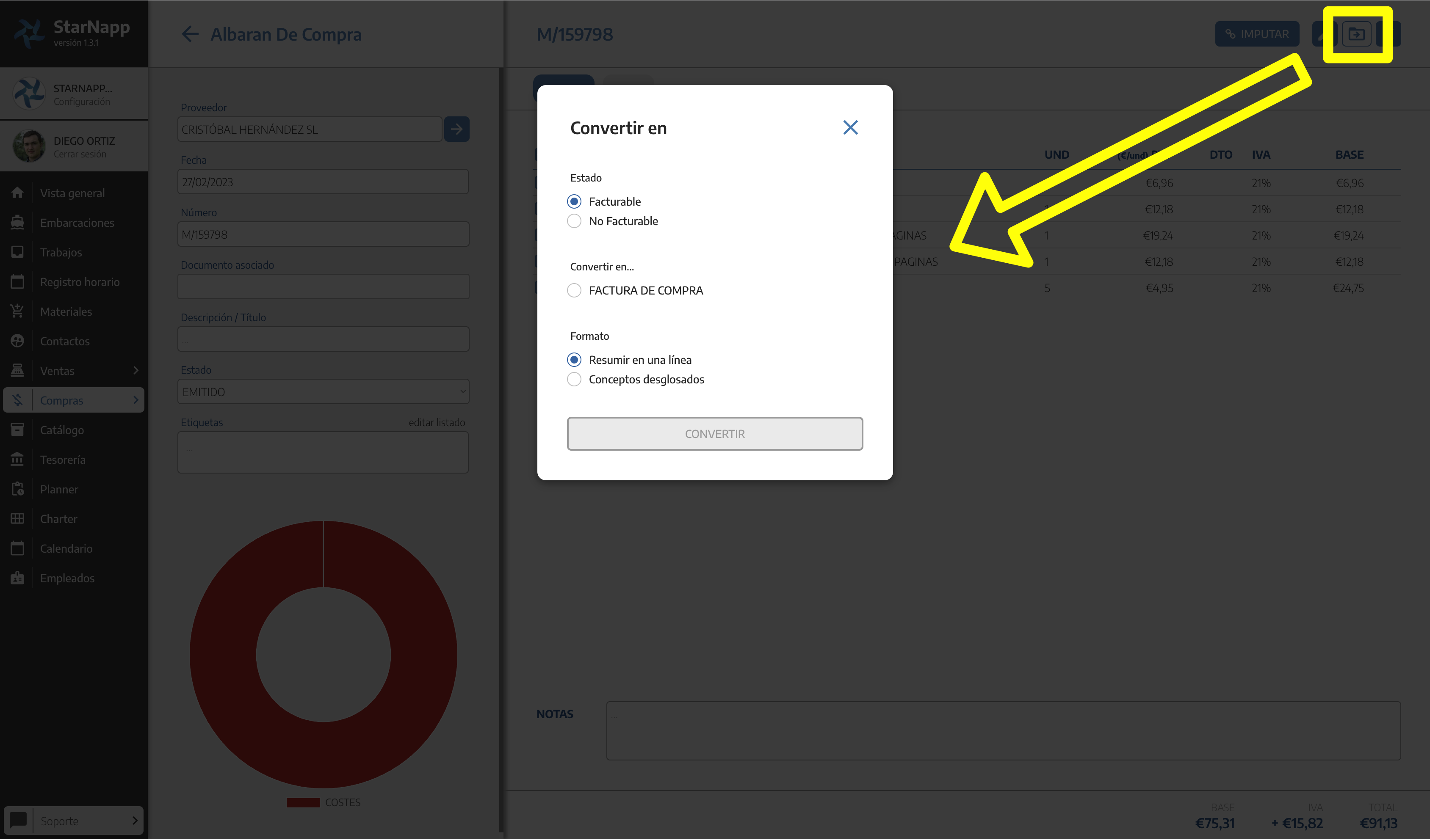 Una vez tenemos un Albarán EMITIDO si recibimos la factura del proveedor y queremos convertir ese albarán en una factura es tan sencillo como hacer click arriba a la derecha en la carpeta con una ➡️ y se nos abrirá una ventana tipo pop-up donde nos indicará qué queremos hacer con el Albarán, convertirlo en Factura o cerrarlo como No facturable, así como la posibilidad de unir varios albaranes en una línea por albarán para dicha factura o desglosar todos los conceptos de este albarán.