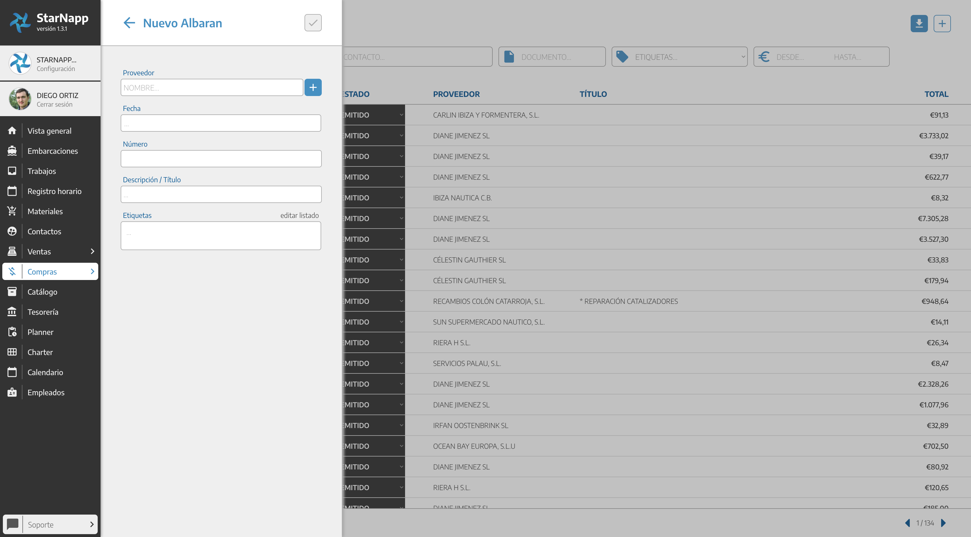 Para registrar un nuevo Albarán o Factura únicamente tenemos que darle al signo ➕ situado arriba a la derecha, donde se abrirá en la parte izquierda la ventana de carga de los datos del proveedor al que se ha realizado dicha compra.