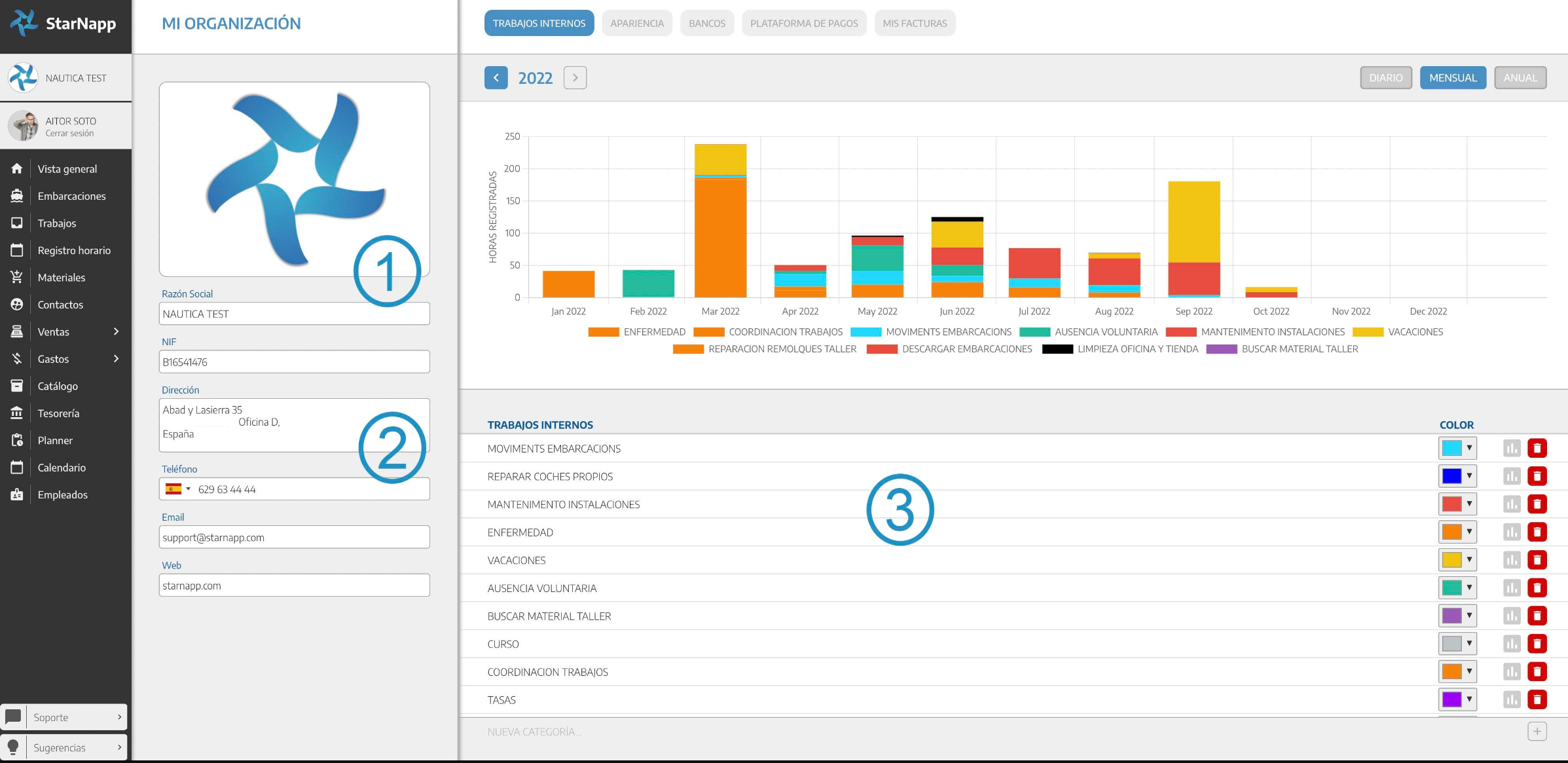 Introduce las tareas internas que se realizan en tu náutica y asígnales un color a cada una. Cualquier tarea donde quieras que un empleado asigne horas puedes incluirla. Escribe donde te indica NUEVA CATEGORÍA... y podrás añadir cuantas quieras. Recuerda que estas categorías son aquellas que no están destinadas a una OT y/o que luego se puedan facturar, sino categorías no relacionadas con un trabajo a un cliente.
