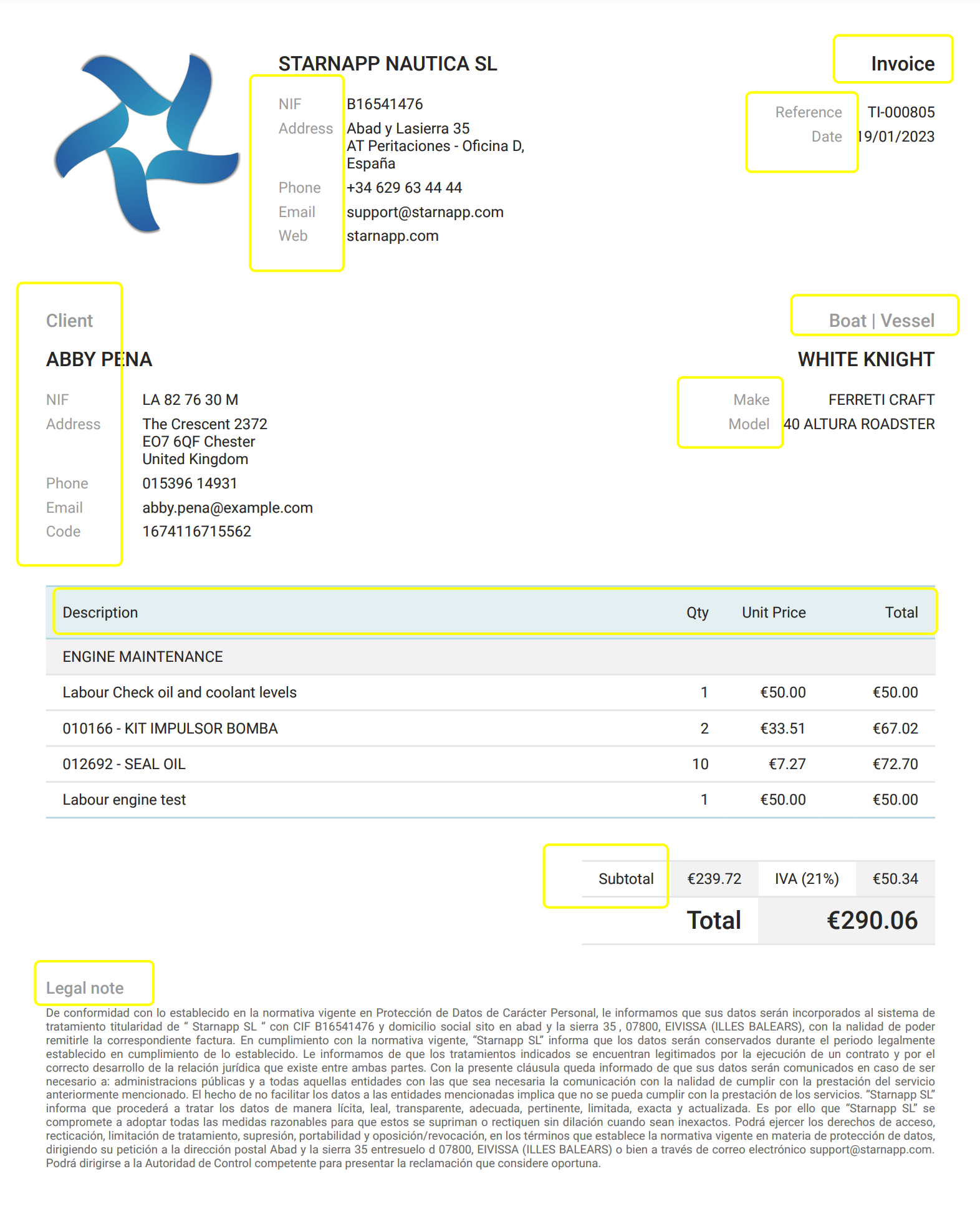 Obtendremos una factura final la cual estará en su totalidad en Inglés que es el idioma que hemos asignado a este cliente.