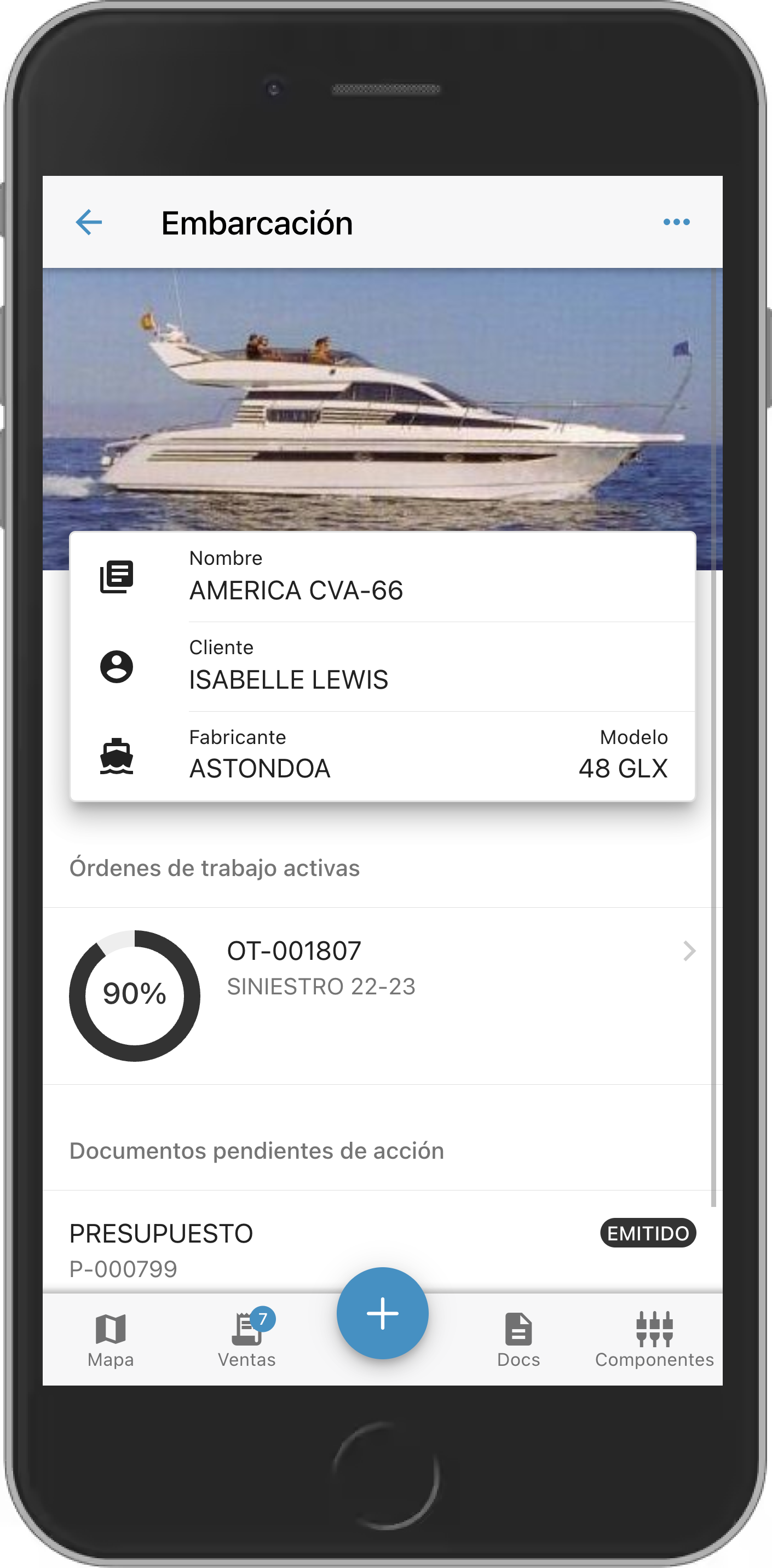 COMPONENTES:Con un simple vistazo podemos conocer en cualquier momento tanto la situación donde se encuentra la embarcación, si tiene Ordenes de Trabajo abiertas saber el progreso de las mismas, y verificar tanto la documentación de la embarcación, los trabajos, los componentes que tiene.