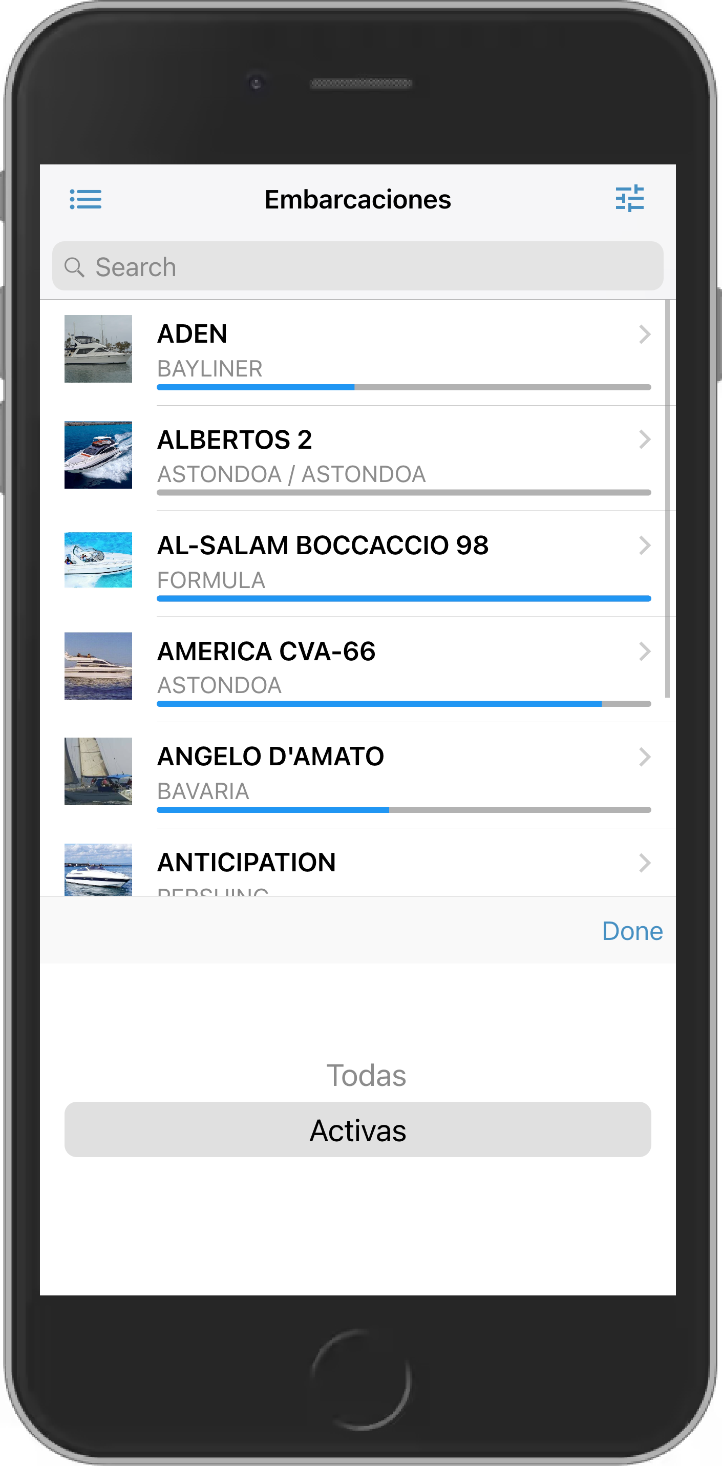 Como puedes observar, las embarcaciones que están ACTIVAS tienen la barra de estado de la Orden de Trabajo en color azul con el proceso de las tareas efectuadas de las Ordenes de Trabajo que tienes pendientes en esa embarcación.
