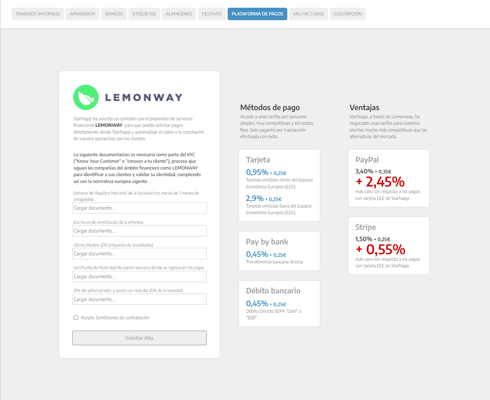 Para la configuración de pasarela de pagos a través de StarNapp y que al enviar un documento de venta el cliente directamente pueda abonarlo creándose no sólo el registro y anotación de dicho pago en tesorería sino también en el documento asociado, es necesario aportar documentación requerida por nuestro partner LEMONWAY.